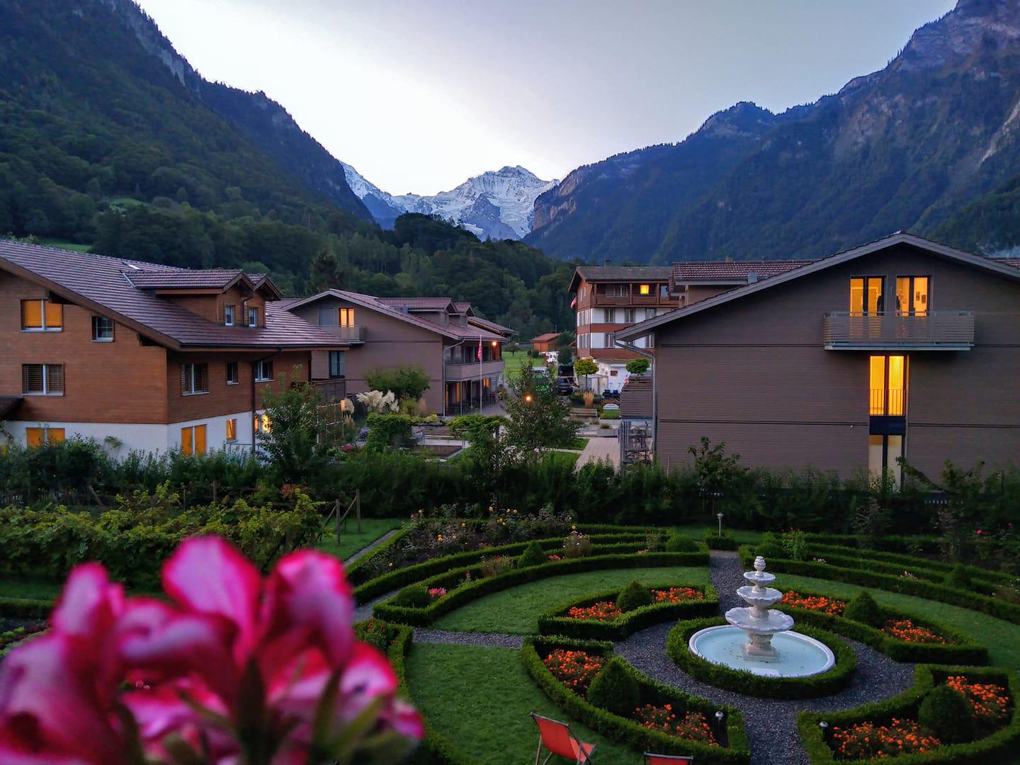 Les invités peuvent prendre leurs repas sur les différentes terrasses avec une vue imprenable sur les montagnes de la Jungfrau. Le bâtiment principal de l’hôtel dispose d’une magnifique terrasse extérieure, couverte et rénovée où vous pouvez savourer le petit déjeuner et autres repas. La terrasse est décorée de nombreuses plantes parfumées ainsi que de magnifiques plantes grimpantes, dont des glycines, des roses, des lis et même des kiwis. Devant cette terrasse, vous trouverez un jardin en pente rempli de plantes de lavande violet et de quelques très vieux rosiers aux parfums de temps anciens.